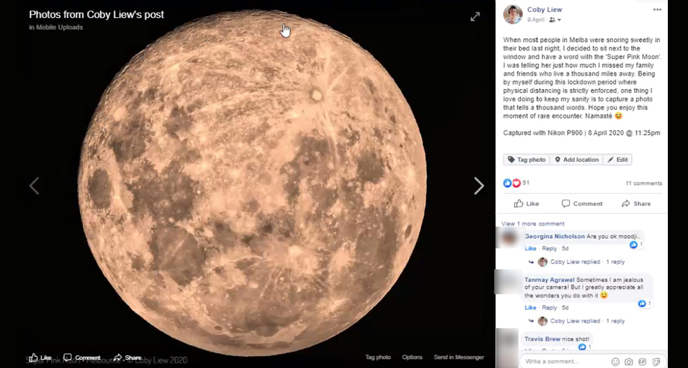 上周,江佩娟在线上教学时,学生提及超级“粉红”月亮,并表示在4月8日夜晚守候观景不果。江佩娟想起她的朋友刘永康成功拍摄月亮且上传至面子书,有意向朋友借这组照片在课上分享,意外获得朋友自荐在澳大利亚上Lark与廉中生视频分享拍摄过程。