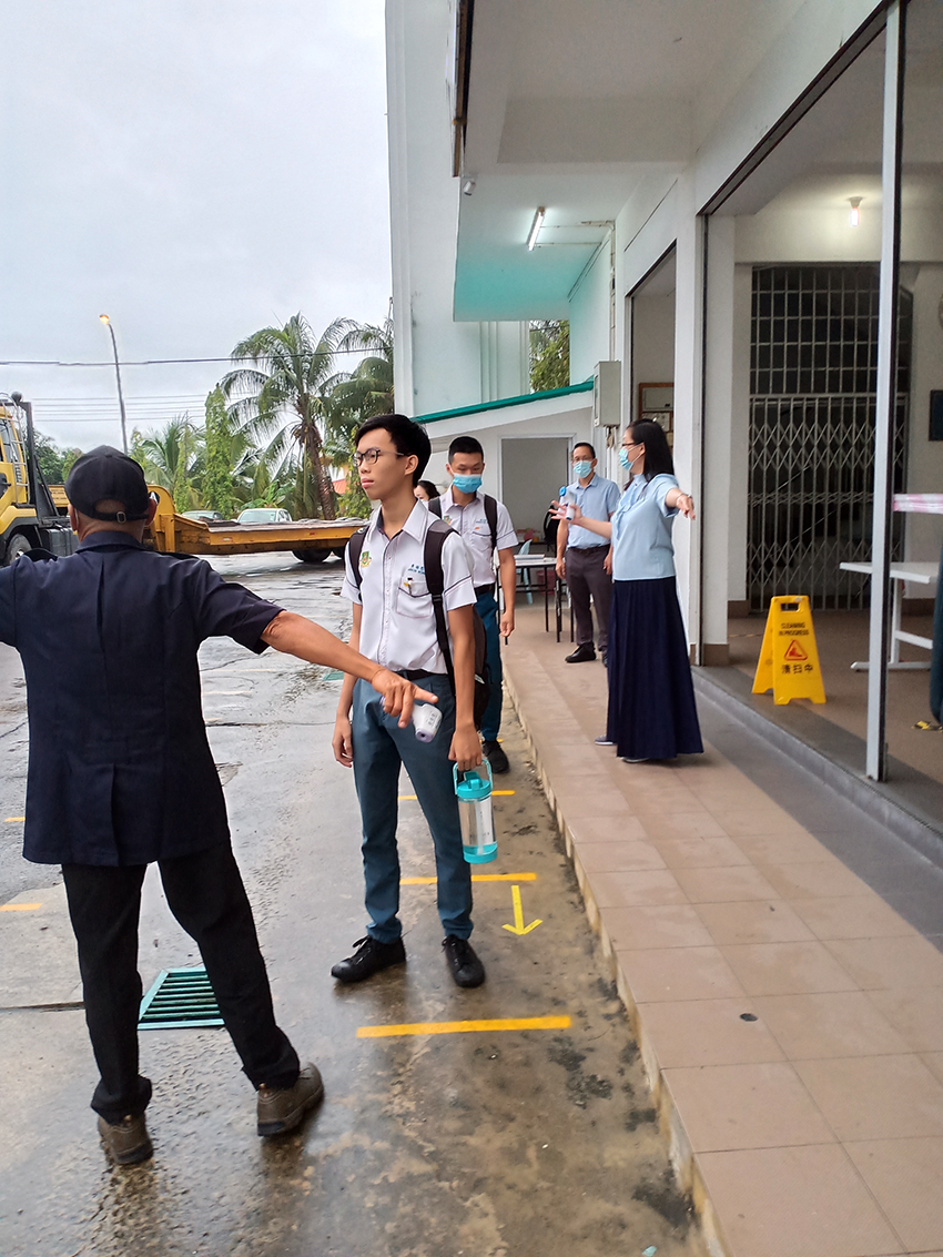 早上6时许,数名教师守在廉中校门口,引导高二生进校。教师欢迎学生返校的同时,也确保每一名踏入校园的学生都戴上口罩,并叮咛学生保持社交距离,快速通过测温、洗手消毒通道。