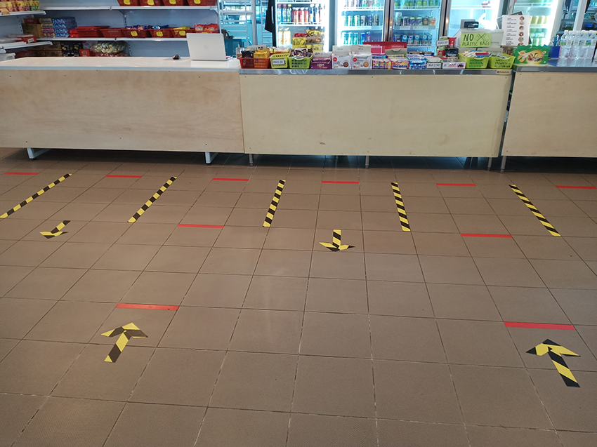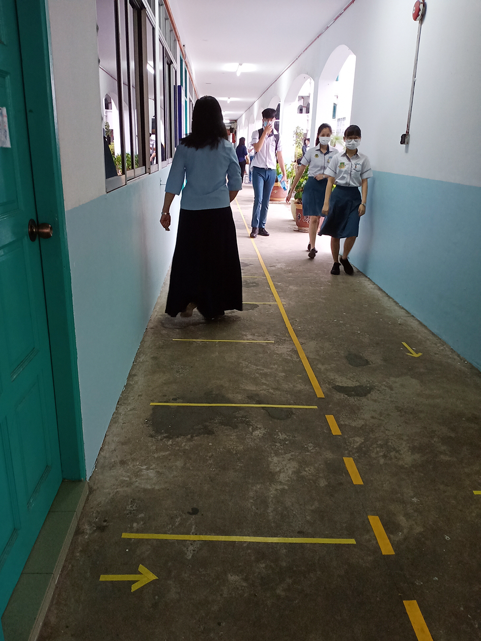 通过测温通道的学生按标示来到食堂预订食物,把餐盒交给食堂业者,再按标示到各自的班级。为保持距离,该校已在走廊、食堂走道、厕所等贴上社交距离标示。