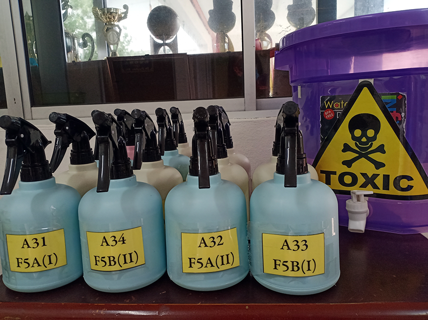 休息时段,学长及教师也会适当控制如厕人数,避免学生扎堆上厕所。各班放置消毒液,在教师协助下按时为班上的桌椅消毒。放学后,校工会在校园、课室以及食堂进行全面消毒。