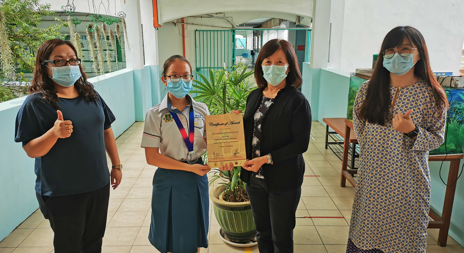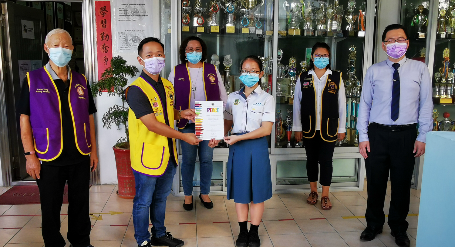廉中生黄恩慧在狮子会成员见证下接过奖状。