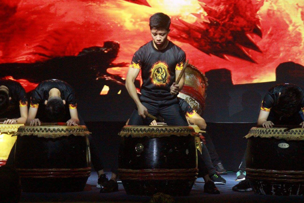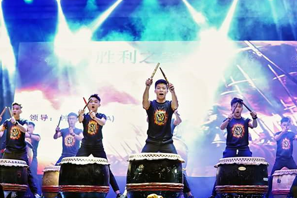 廉中校友锺狄纬,于2017年在廉中文娱晚会上击鼓的英姿。