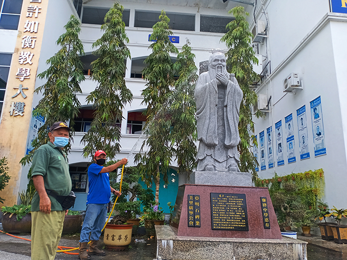 (美里讯)尽管目前学生居家上网课,廉律中学依然重视校园的整洁,日前,两名校工合力洗刷孔子石像,让它恢复清新原貌,以示尊重至圣先师。这也是营造良好校园氛围的一部分努力。
