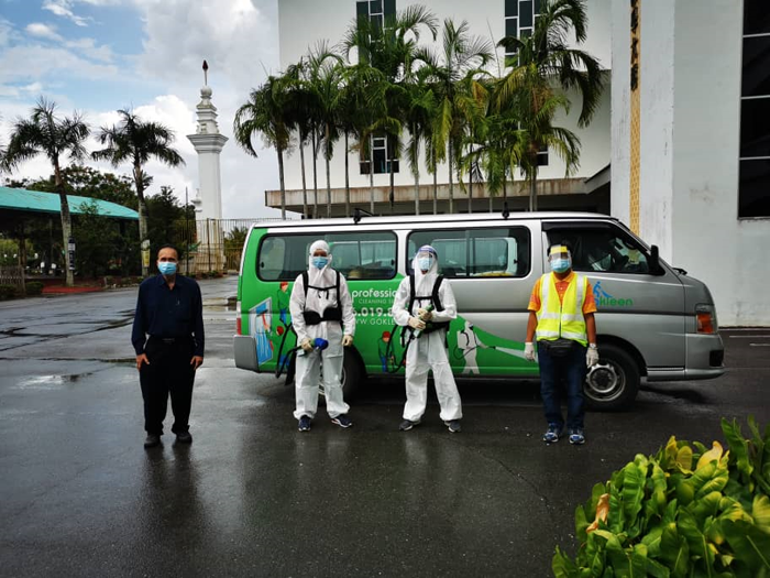 廉中校长刘世聪(左)感谢GoKleen公司团队协助该校进行校园消毒。