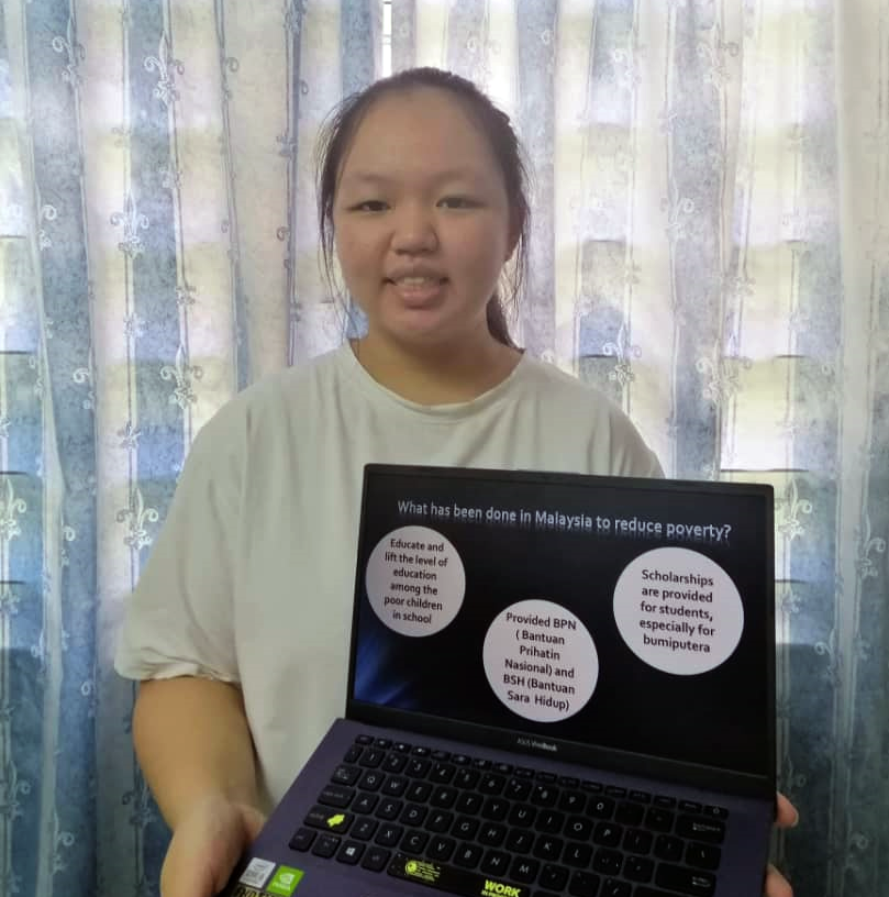“在整理资料呈现的过程中,我了解到世界上穷人的百分比,我也查询各国怎么救助这些贫困者的方式,我也明白目前身为学生的我,可以以个人小小的力量支持慈善团地活动比如义跑、义卖等,来帮助有需要的人。”