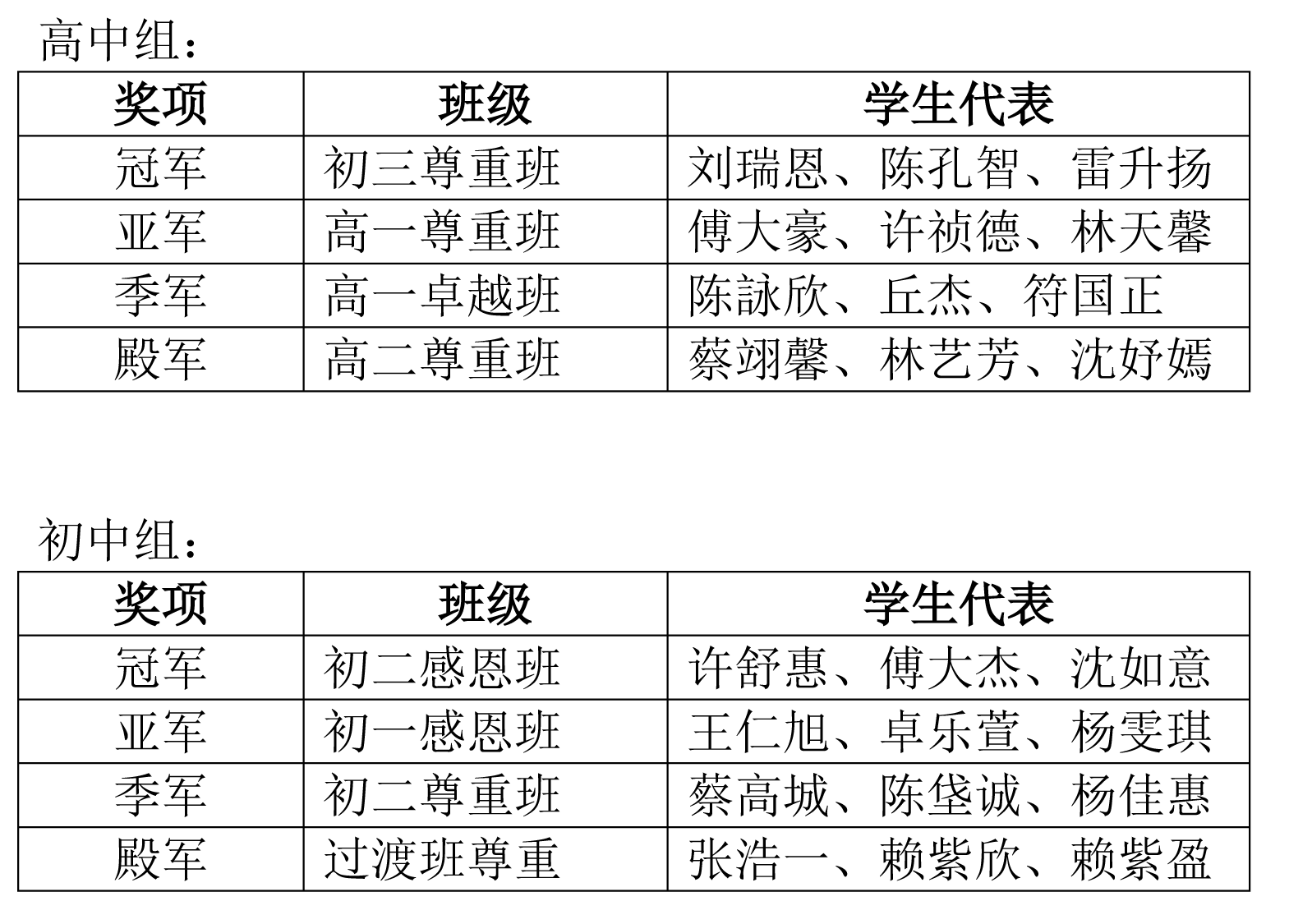 初三尊重班刘瑞恩、陈孔智、雷升扬夺得高中组冠军。初二感恩班许舒惠、傅大杰、沈如意夺得初中组冠军。