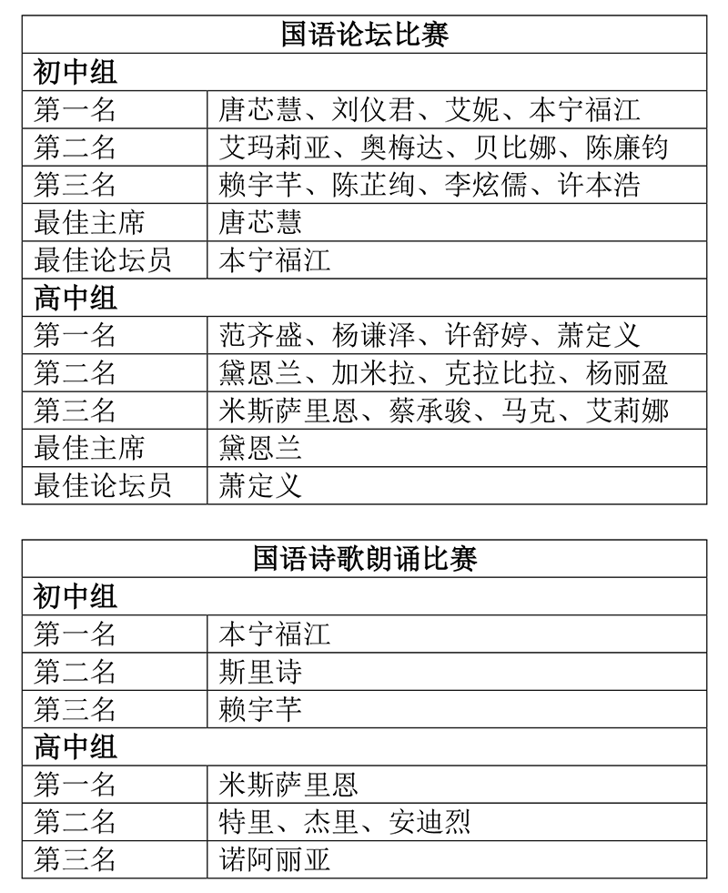 他说,该校马来文组在过去一个月来在校进行了国语论坛比赛、国语诗歌朗诵比赛、爱国歌曲演唱赛等,所有比赛都顺利进行,从中可观察到廉中生的马来文掌握能力佳。