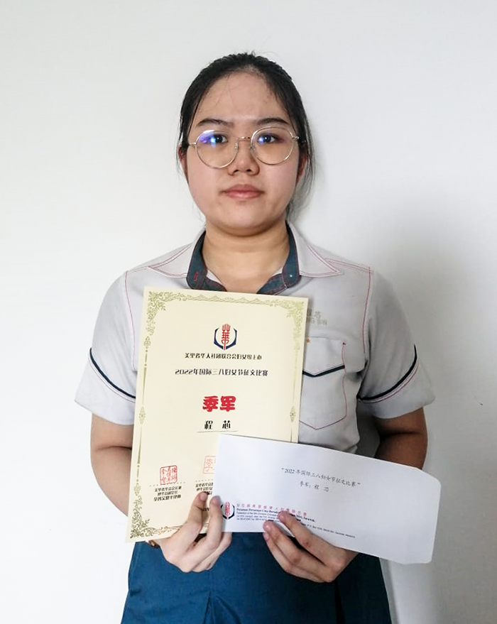 (美里讯)在“2022年国际三八妇女节征文比赛”中,廉律中学高二卓越班的程芯获得季军。