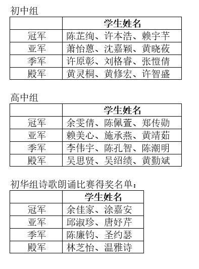 此外,该校华文组近来举办了初华组诗歌朗诵比赛,江佩娟祝贺所有得奖的学生。