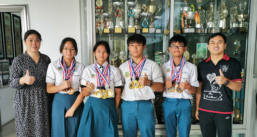 廉中杰出射手与师长合影,左起为代校长江佩娟、黄于绮、刘语恩、刘佑杰、