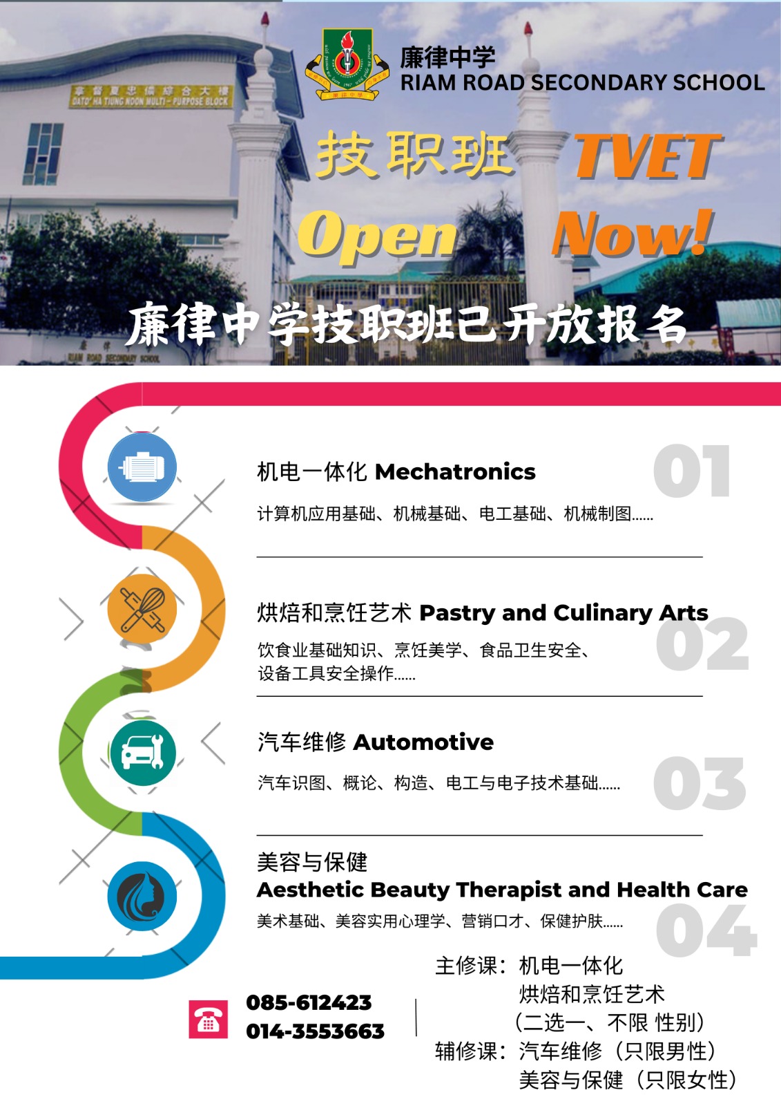 廉律中学技职班已开放报名,目前开设课程为机电一体化、烘焙和烹饪艺术、汽车修护及美容与保健。技职班的主修课为机电一体化和烘焙和烹饪艺术(二选一,不限制性别);辅修课为汽车修护(只限男性报读)、美容与保健(只限女性报读),学生可以根据自己的意愿、兴趣、能力和理想选择课程。