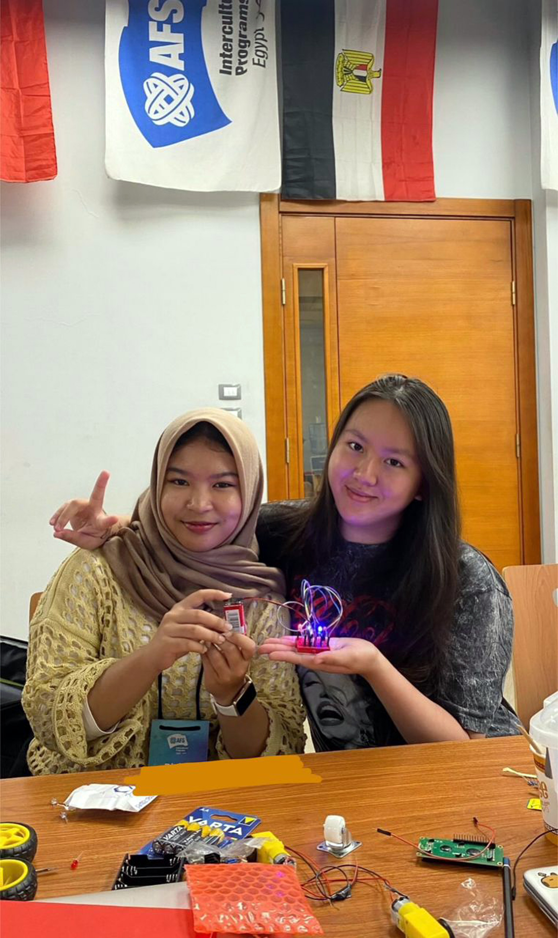 左起来自吉隆坡的培德瑞克, 登嘉楼的凯祖兰及砂拉越美里的余佳家。 余佳家同学(右)与来自印度尼西亚的瑞莎同学(左)学习机器人技术。