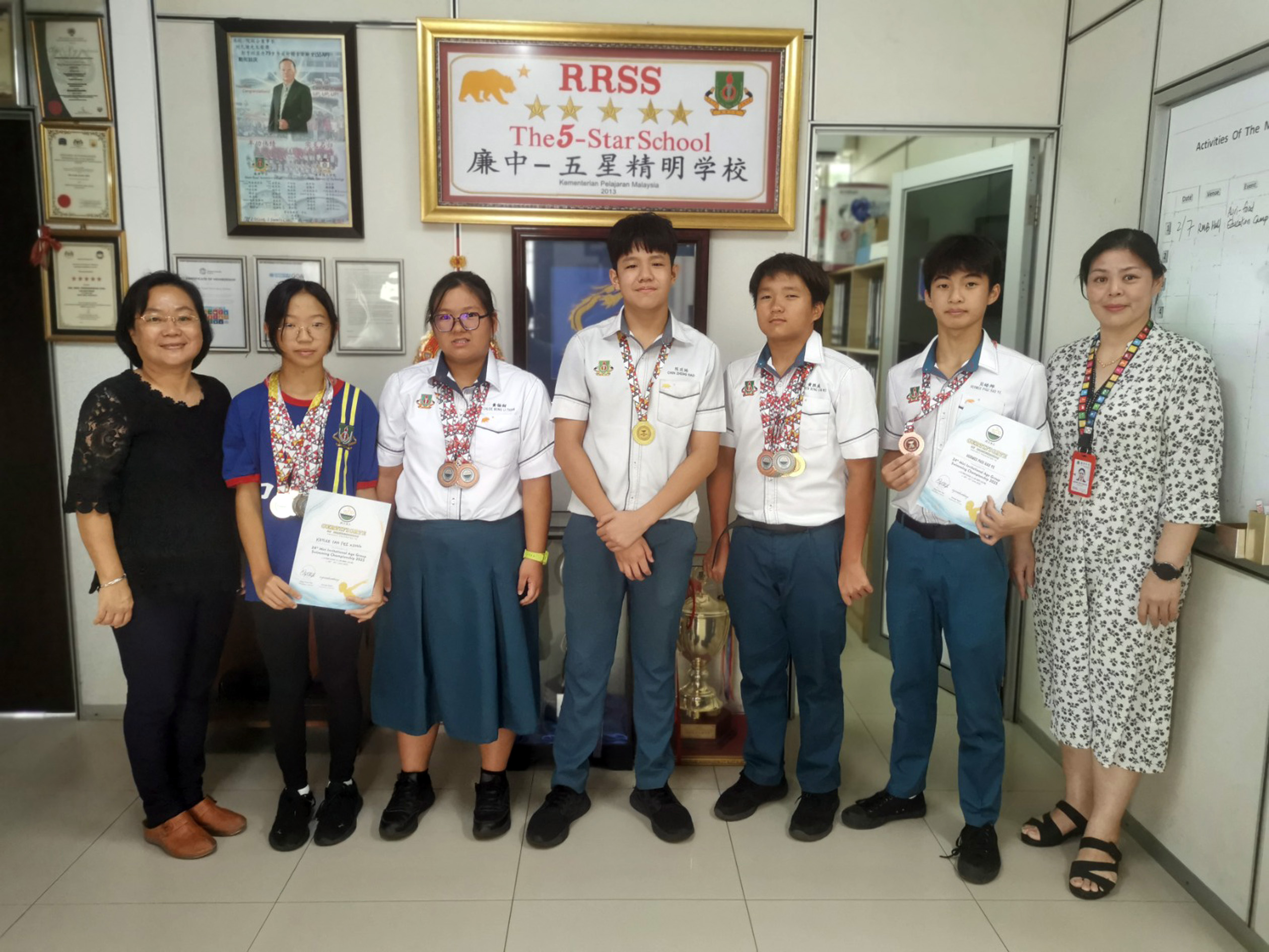 (左起)负责老师陈立玲与同学陈佩芯、黄俪甜、陈政皓、黄胜威及贝皓烨,与(右一)校长江佩娟合影,共同见证荣耀时刻。