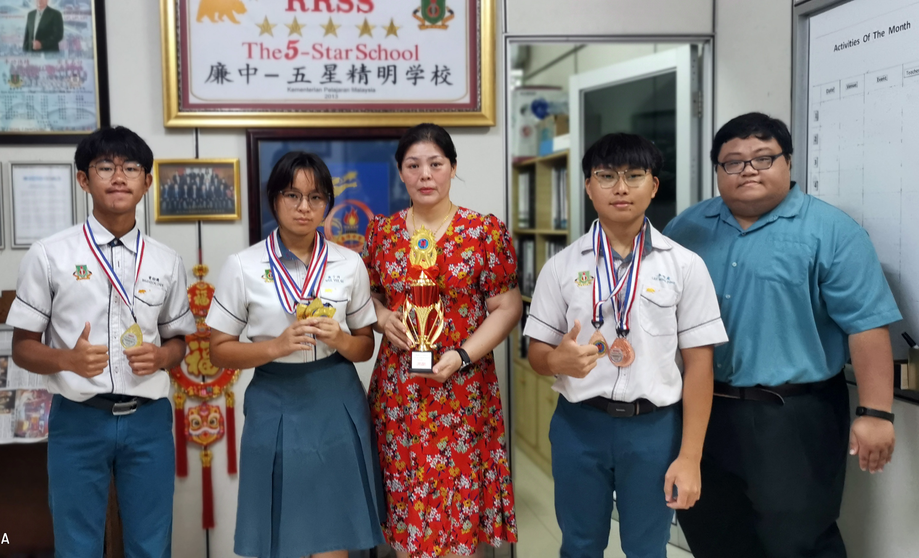 廉中论坛队在2025年砂拉越州中学生论坛比赛中荣获季军佳绩。 (左起)莎莉安•温本老师、诗歌朗诵冠军陈廉钧同学、季军赛勒斯•米楚•安纳•罗宾同学, 以及温智而老师在赛后合影留念,共同见证这荣耀时刻。