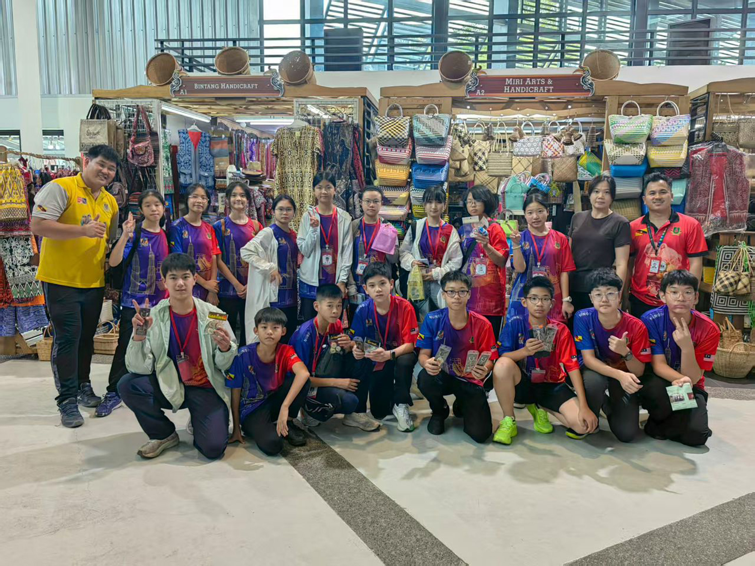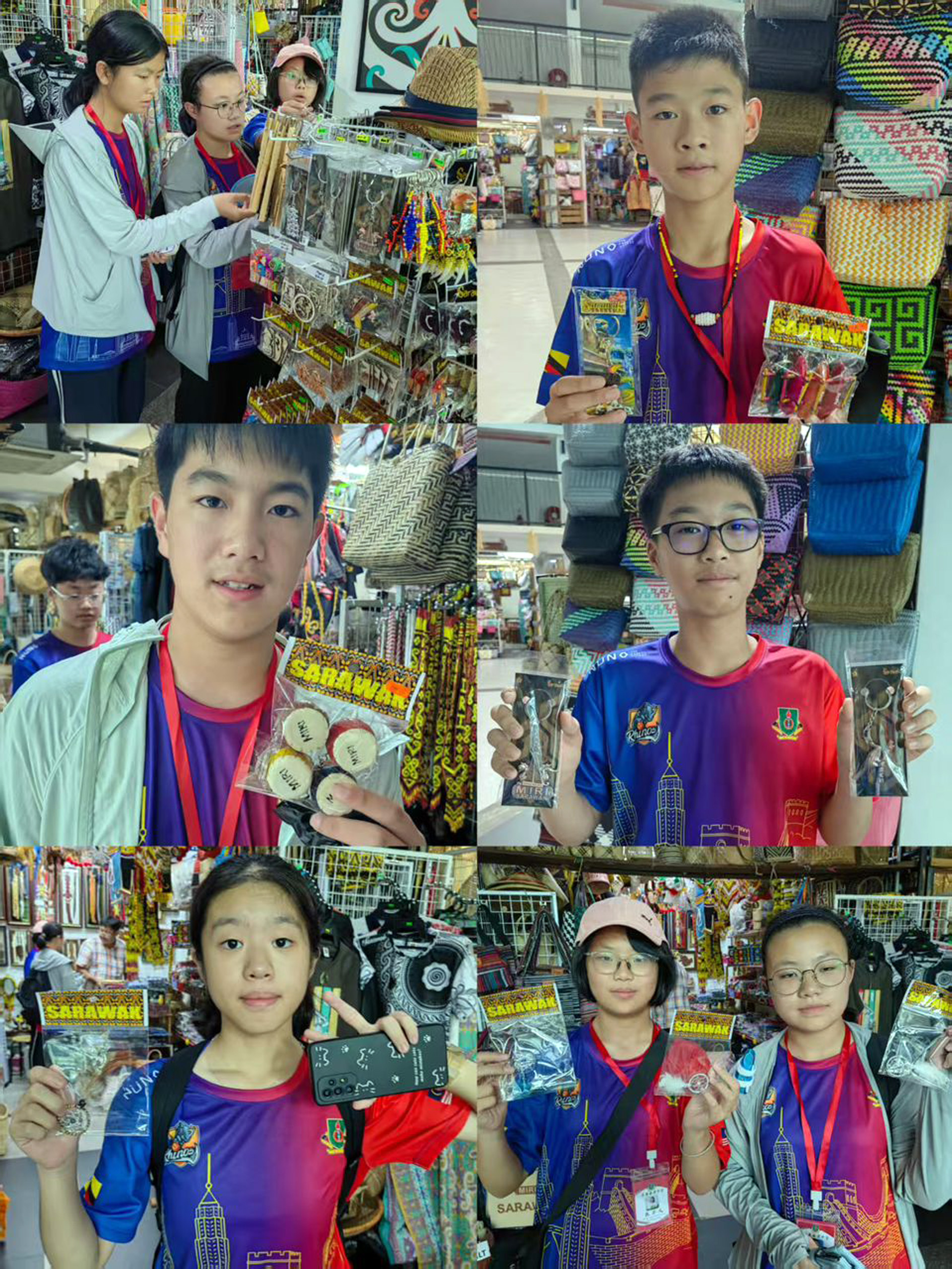 随后,一行人移步至美里手工艺品中心(Miri Handicraft Centre)。该中心展出了本地土著族群如伊班、比达友及肯雅族等的传统手工艺作品,包括编织品、木雕、珠饰和传统服饰。学生们对这些独具特色的文化艺术品产生浓厚兴趣,纷纷合影留念,并积极向摊主请教制作工艺。在互动过程中,学生也深刻体会到砂拉越多元文化的魅力。