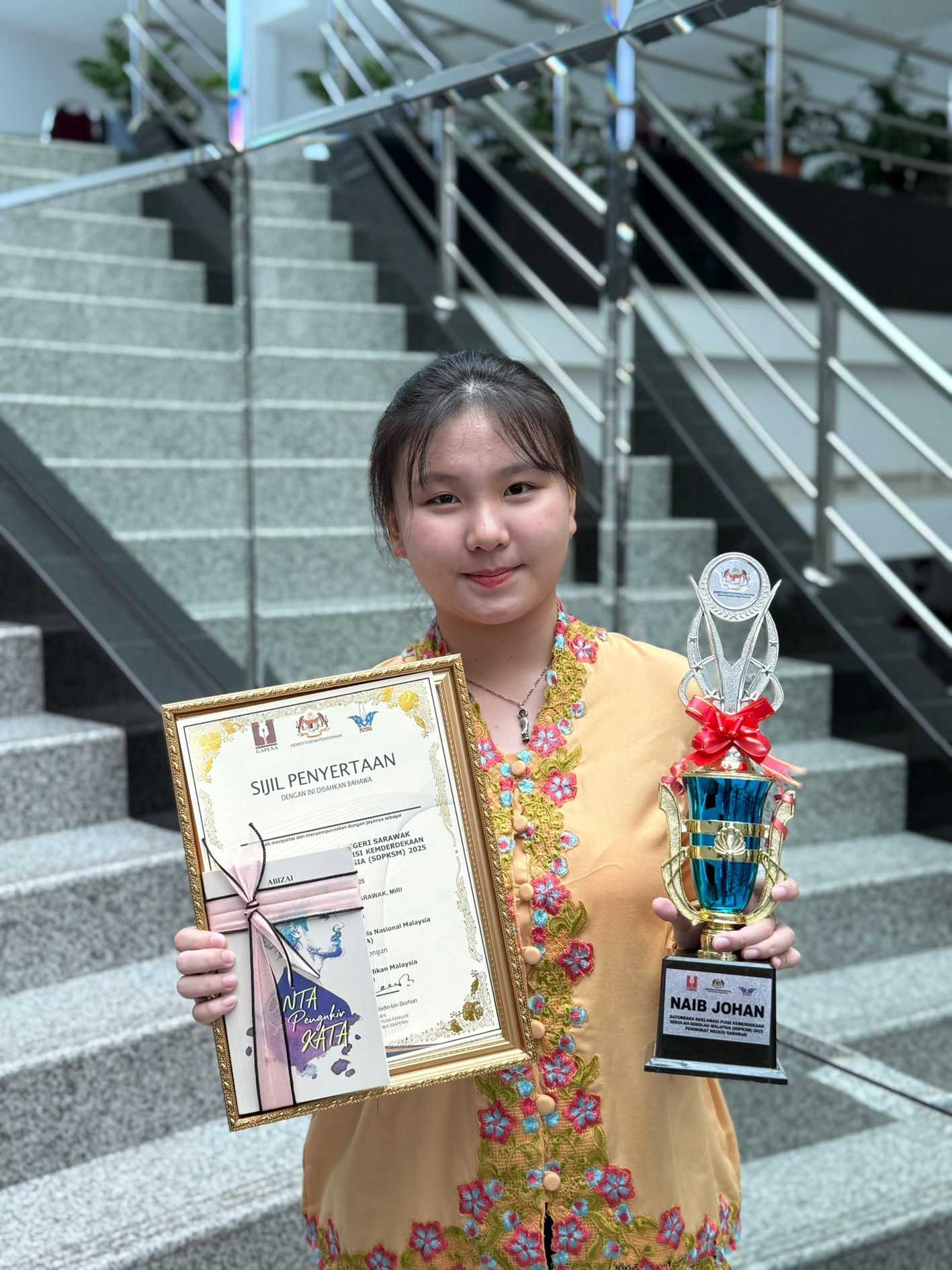 2025年6月6日(星期五),来自美里廉律中学高二尊重班的赖宇芊,在吉隆坡 Menara Ken, Taman Tun Dr. Ismail 举行的 Voices In Bloom International Singing Competition 2025(韵徉之声)总决赛中,凭借卓越的舞台表现和深情的演绎,勇夺 B4组(流行 / 爵士歌曲类)金奖文凭及冠军殊荣,为学校和家乡争光。