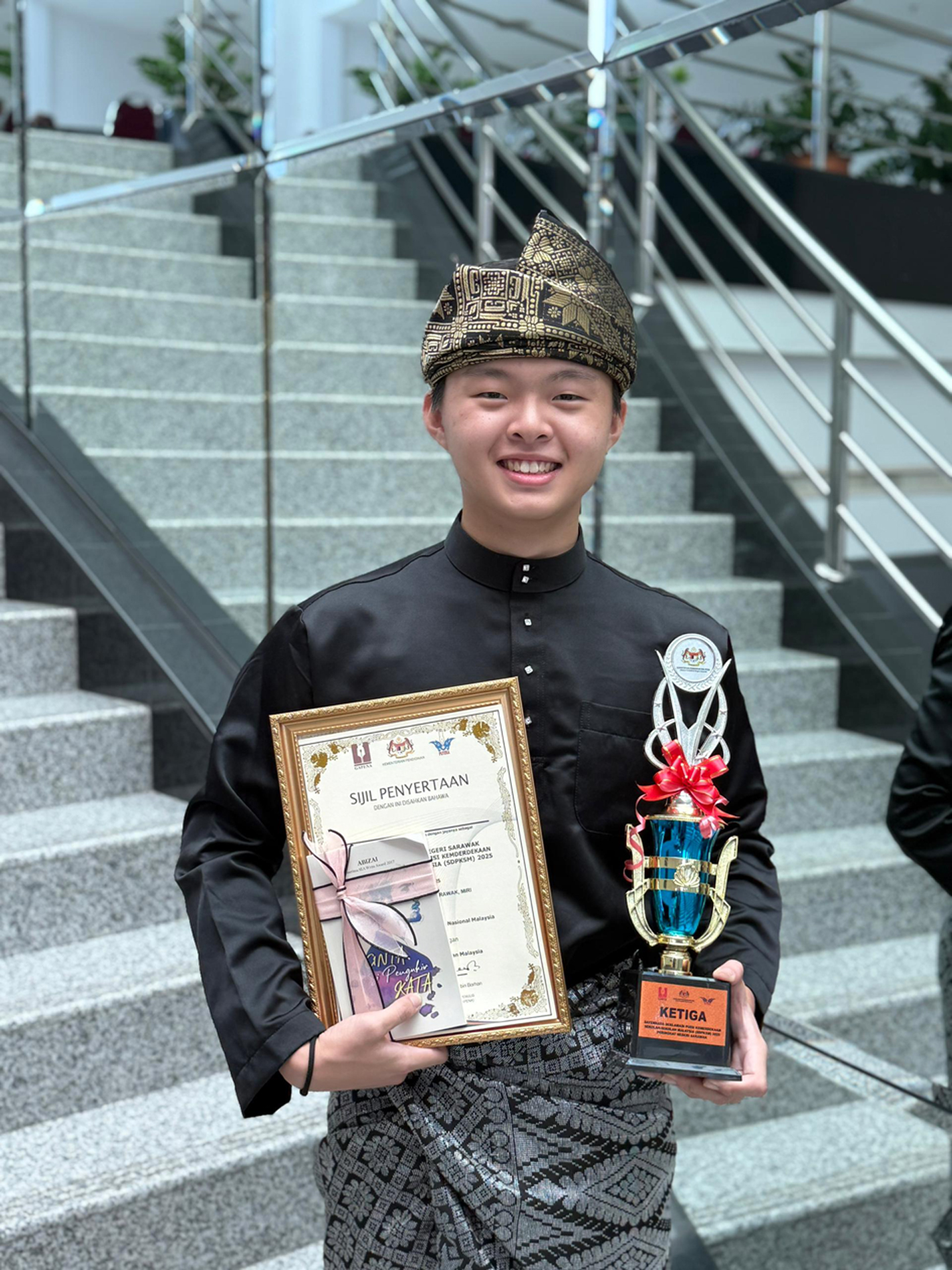 张佳颖同学(初三感恩班)在 2025年全马中小学独立诗朗诵比赛(SDPKSM) 在 2025年全马中小学独立诗朗诵比赛(SDPKSM)砂拉越州赛中,翁康恒同学(初三卓越班)砂拉越州赛中凭借深情的朗诵表现荣获亚军。 则凭借稳健台风与清晰表达夺得季军 。