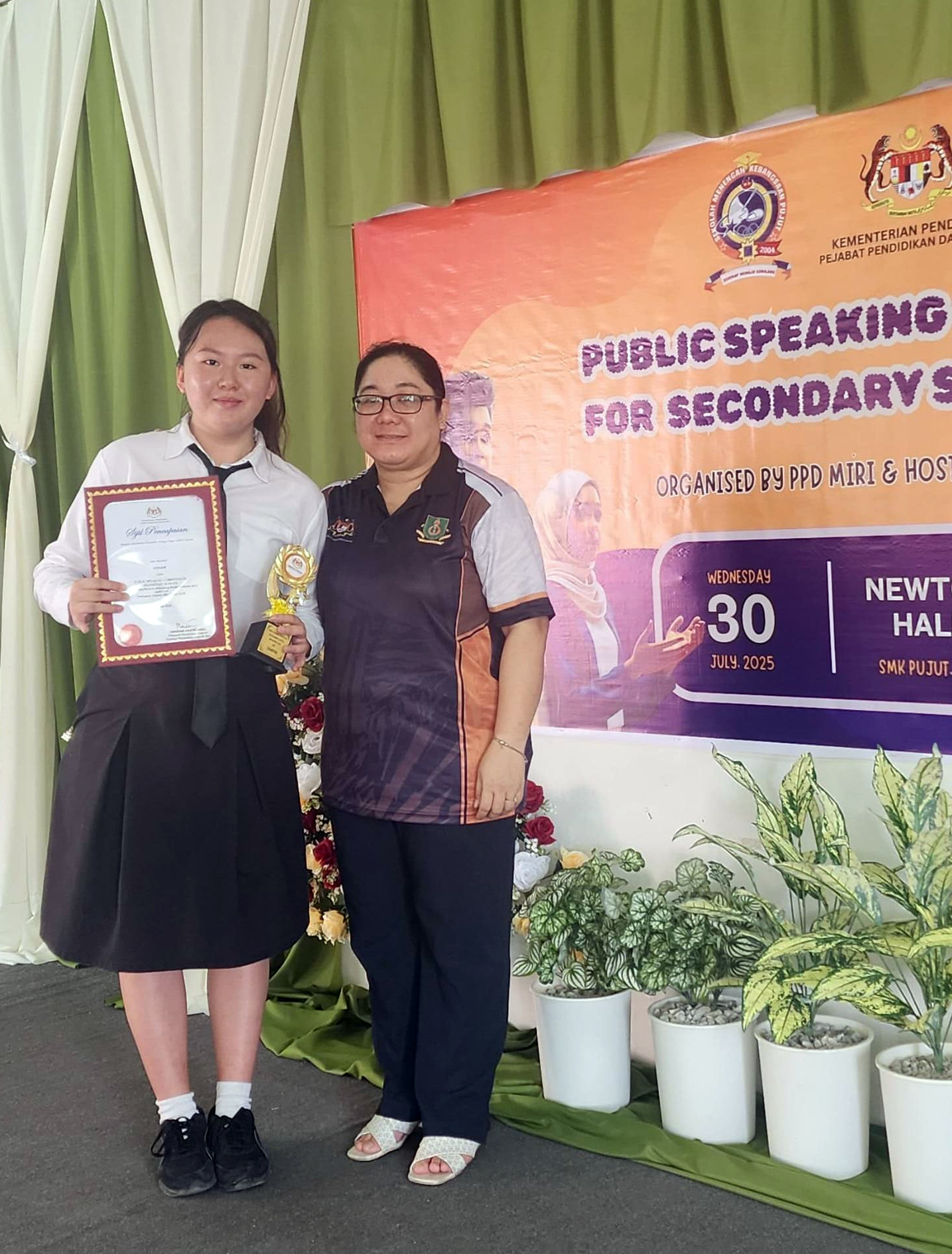 2025年中学英语演讲比赛于7月30日在美里埔奕国中(SMK Pujut, Miri)举行,由美里教育局主办、该校承办。廉中高二廉正班余佳家同学(左)凭借出色的表达与自信表现,勇夺冠军。 右为领队老师艾米丽。