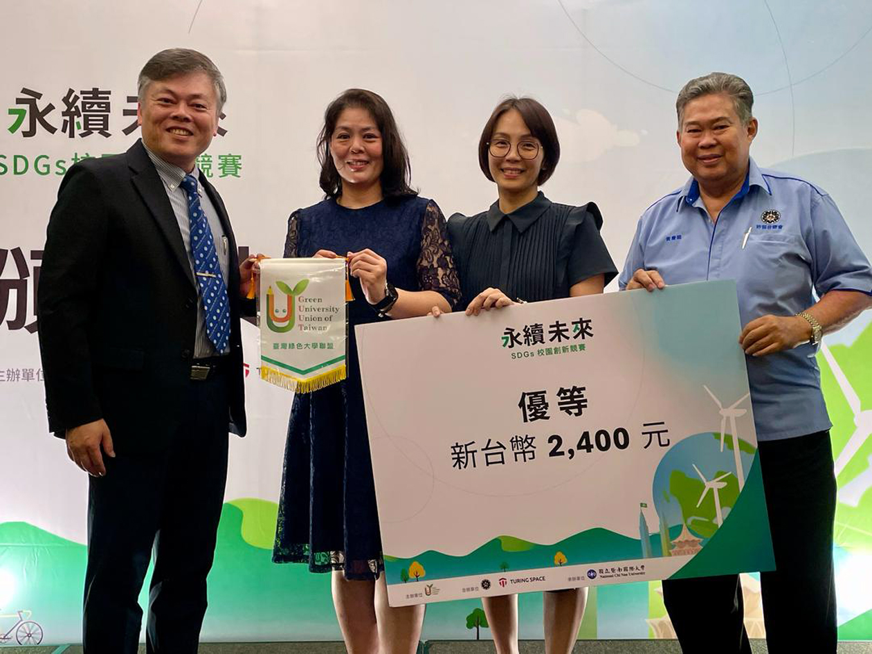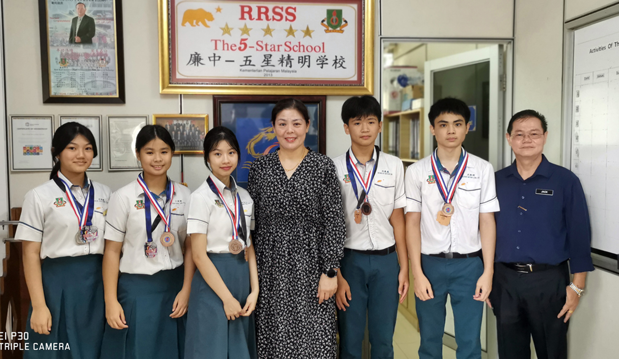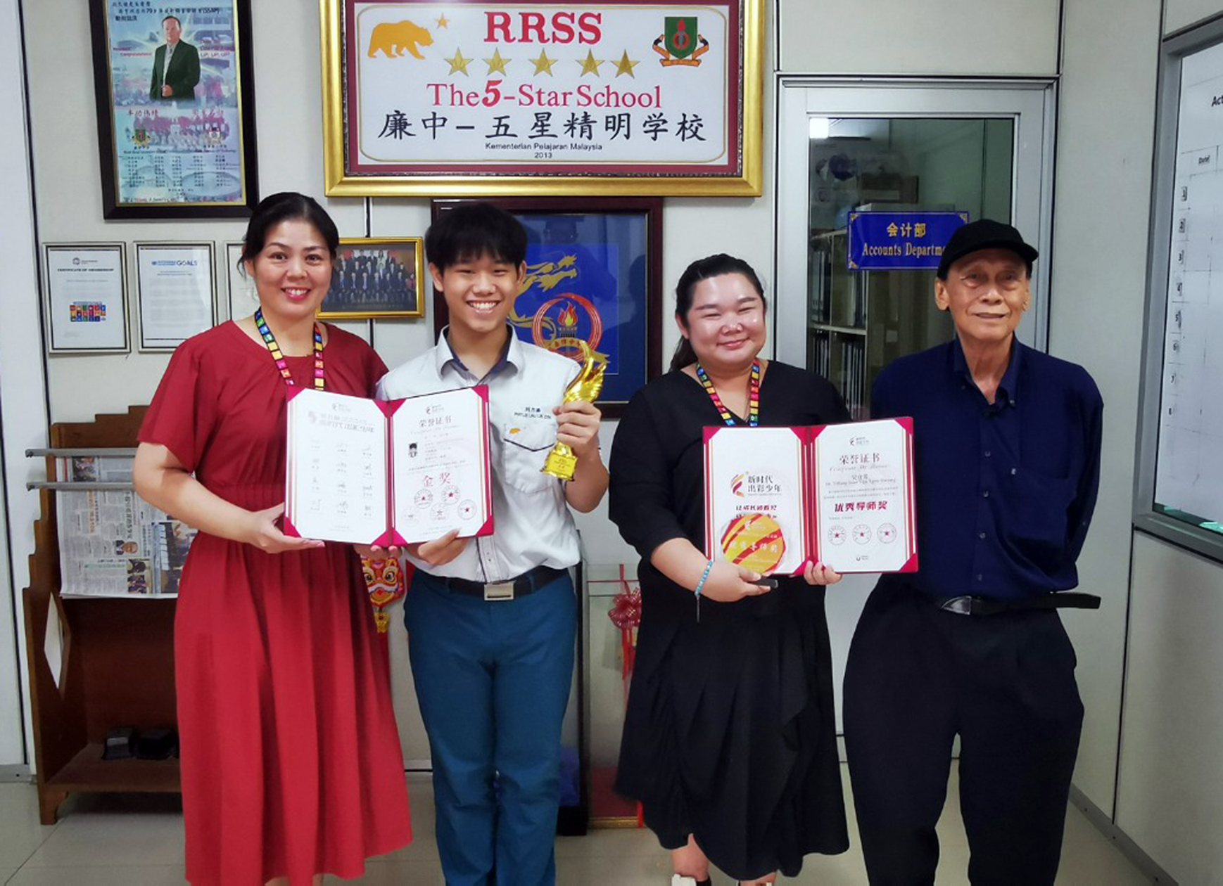 廉律中学江佩娟校长(左2)与指导教师陈诗韵(右2)从主办方领取优等奖时摄。