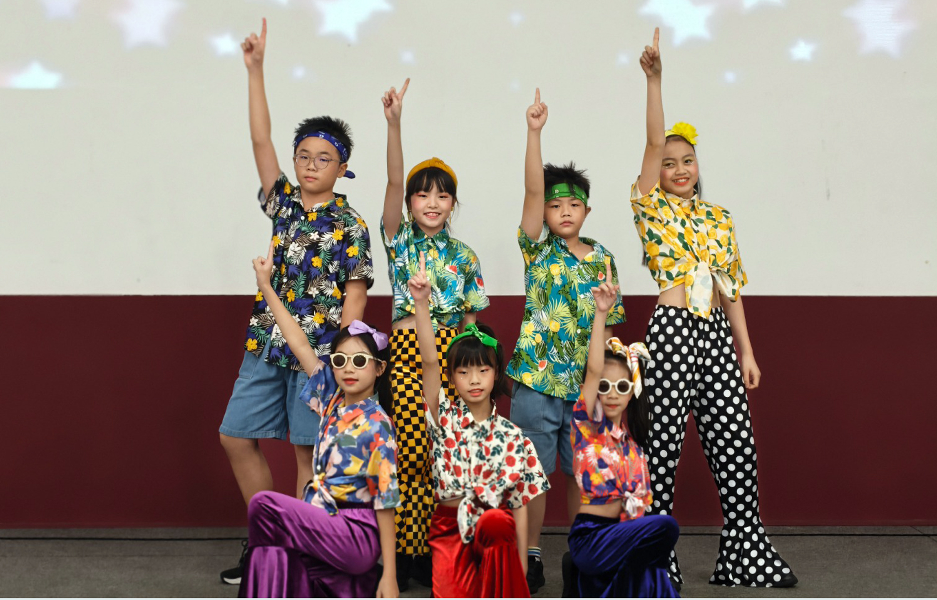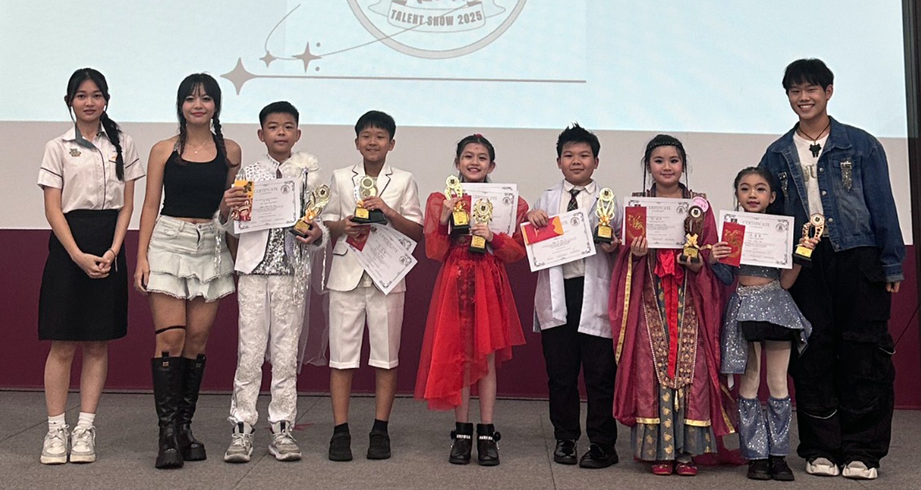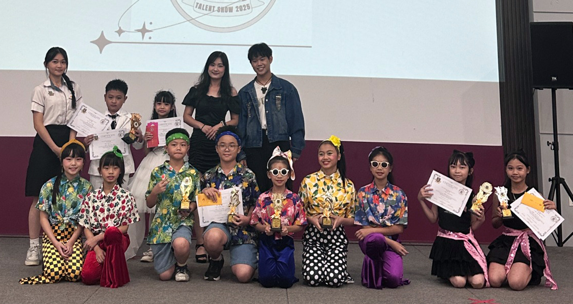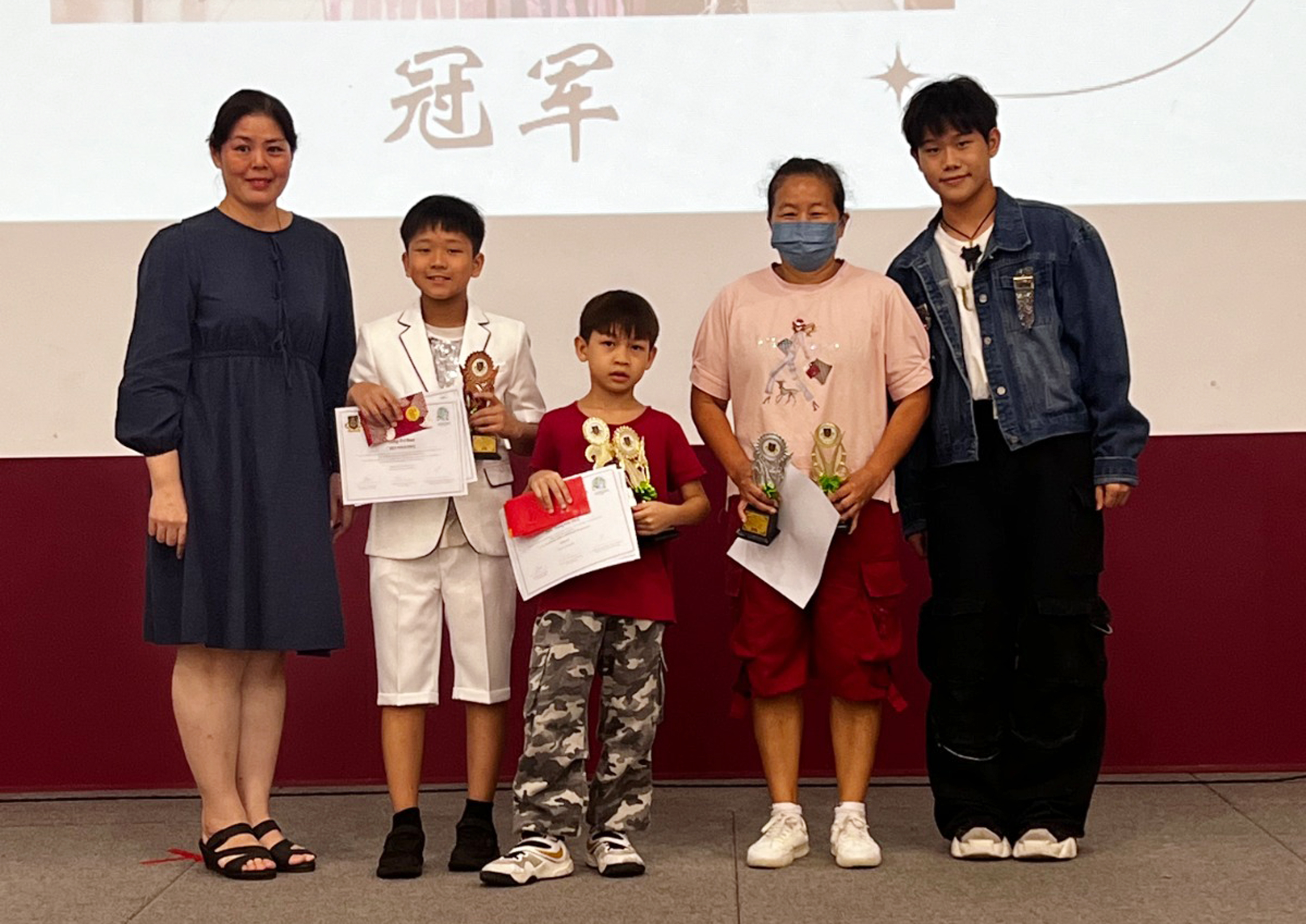 小学才艺大赛筹备会主席张宁同学(后排左一)与总筹备会主席刘力溱同学(后排右一) 团体亚军得主“美丽女王”-以动人的歌声与精彩的舞蹈,展现出十足的舞台魅力。 陪同评审老师黄诗平(后排右二)为团体组获奖选手颁奖,并共同合影留念。