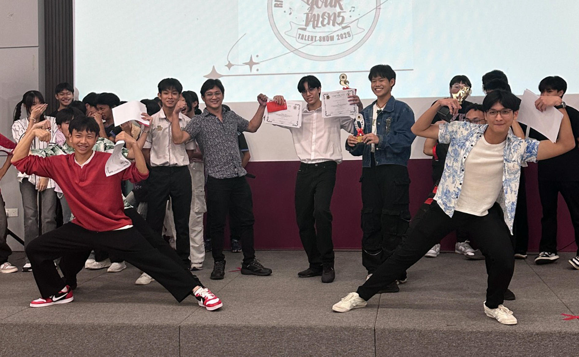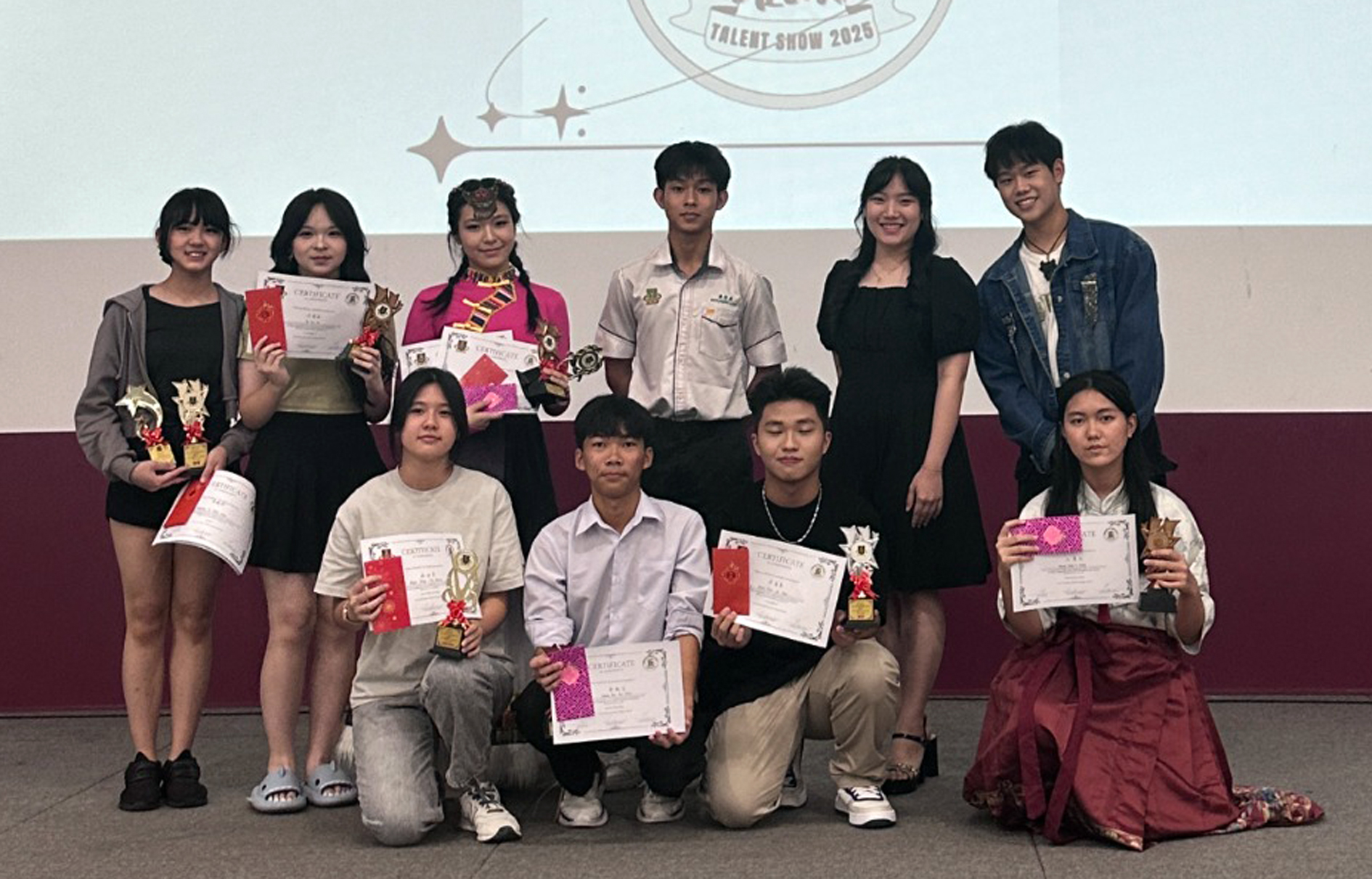 达人秀筹备会主席廖俊威同学(左三)携总筹备会主席刘力溱同学(左一),陪同 亚军组合Baja Soys以幽默搞笑又不失帅气的舞姿与全场观众、评审热烈互动,领奖时更与评审老师 评审老师余之琳(左二)为个人组获奖者颁奖,并与他们合影,定格荣耀时刻。 黄金扬亲切交流,同时斩获‘最具创意奖’与‘最受欢迎奖’两项殊荣。