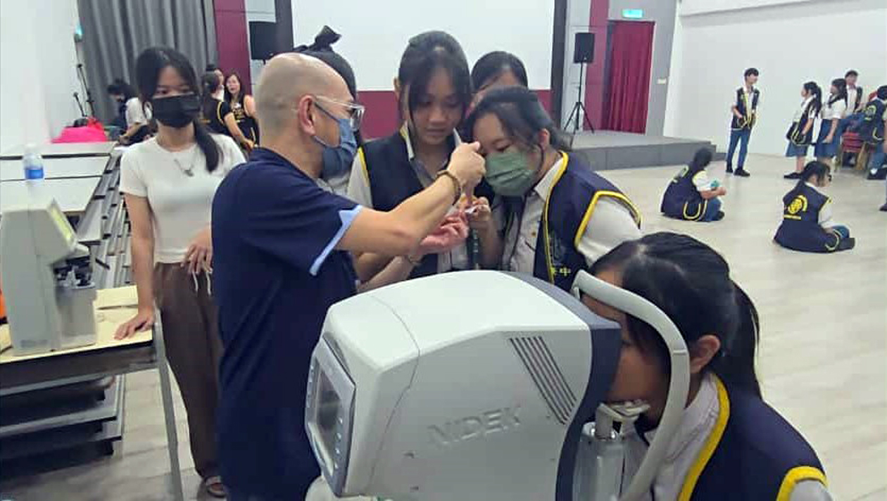 学生们体验当盲人。 美里罗东狮子会前会长张昌盛先生为学生们做基础视力检测。