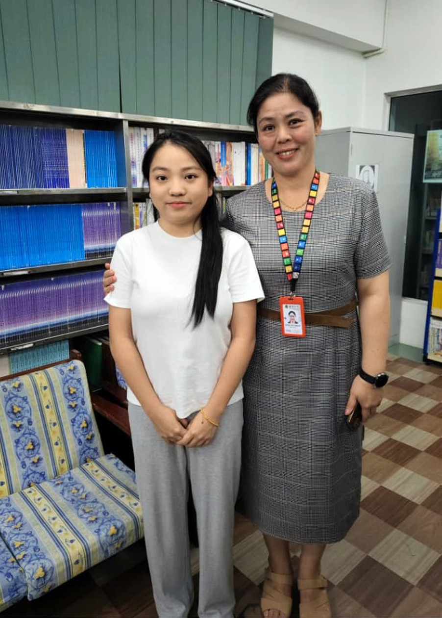 張芳品同學領取SPM成績時,與江佩娟校長合影。她感謝校長當初鼓勵她勇於報讀SPM雙軌班,方讓她多一種語言優勢。